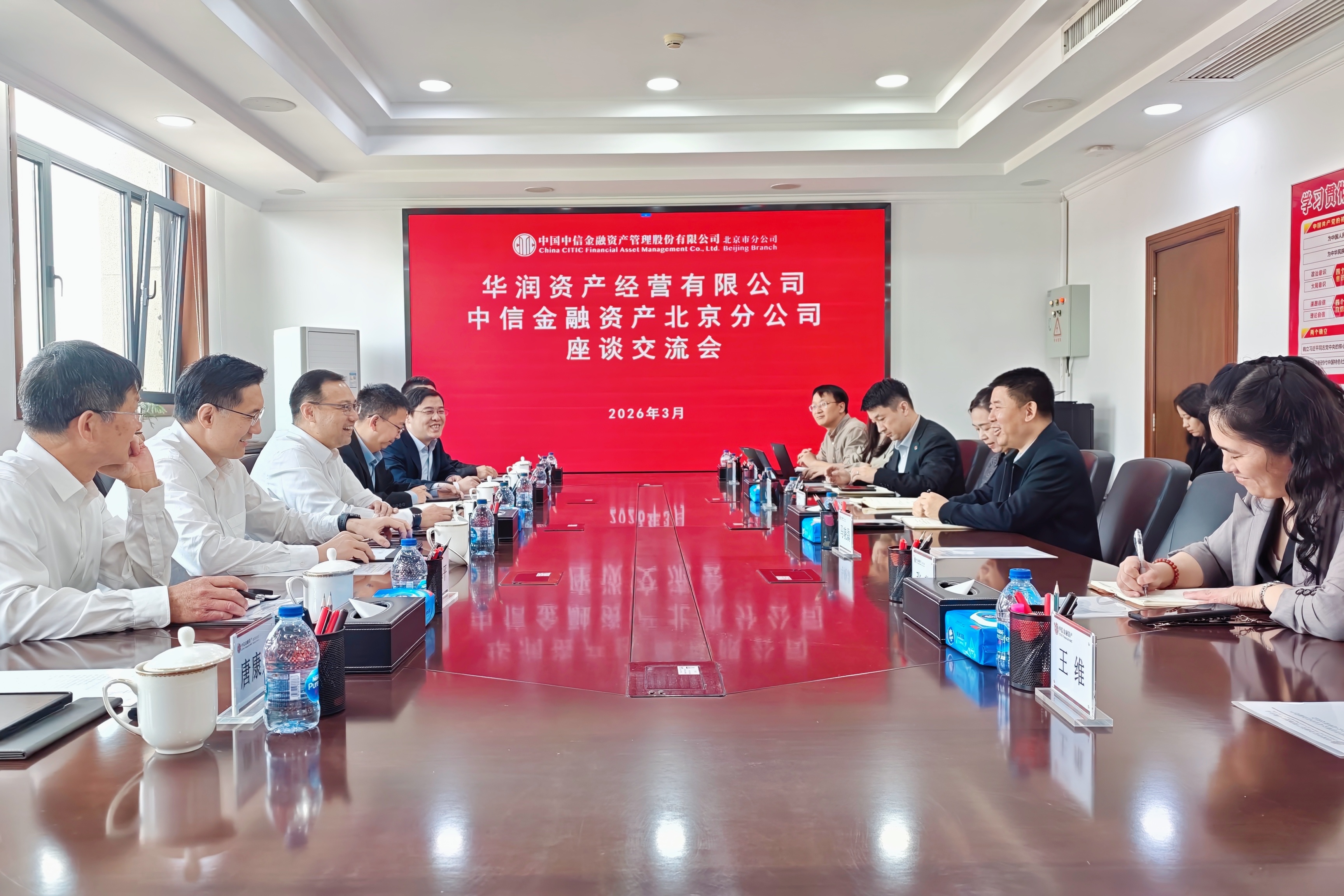 26日上午,拜访中信金融资产北京分公司时,中信金融资产北京分公司党委副书记、副总经理胡江接待并主持座谈会。中信金融资产重点介绍了其在服务央国企、低效资产盘活等方面的业务布局。双方就发挥各自在资金、产业运营及不良资产处置领域的资源优势进行深入交流,明确了“联合投资+联合运营”的合作方向,并围绕重点标杆项目达成合作意向。中信资产北京分公司相关部门负责人参与了座谈。